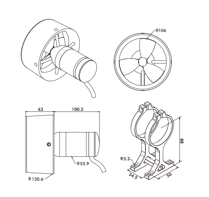 | Material of the nozzle | POM | Applications | Unmanned surface vehicle, Electric surfboard,Handheld thruster,etc. |