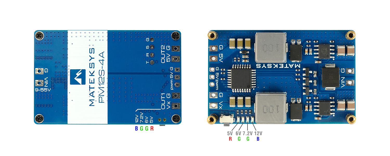 • OUT-1 Vx, 5V / 6V / 7.2V / 12V output options(5v default). 4A continuous, 5A Peak. ON/OFF is controllable by PWM signal.