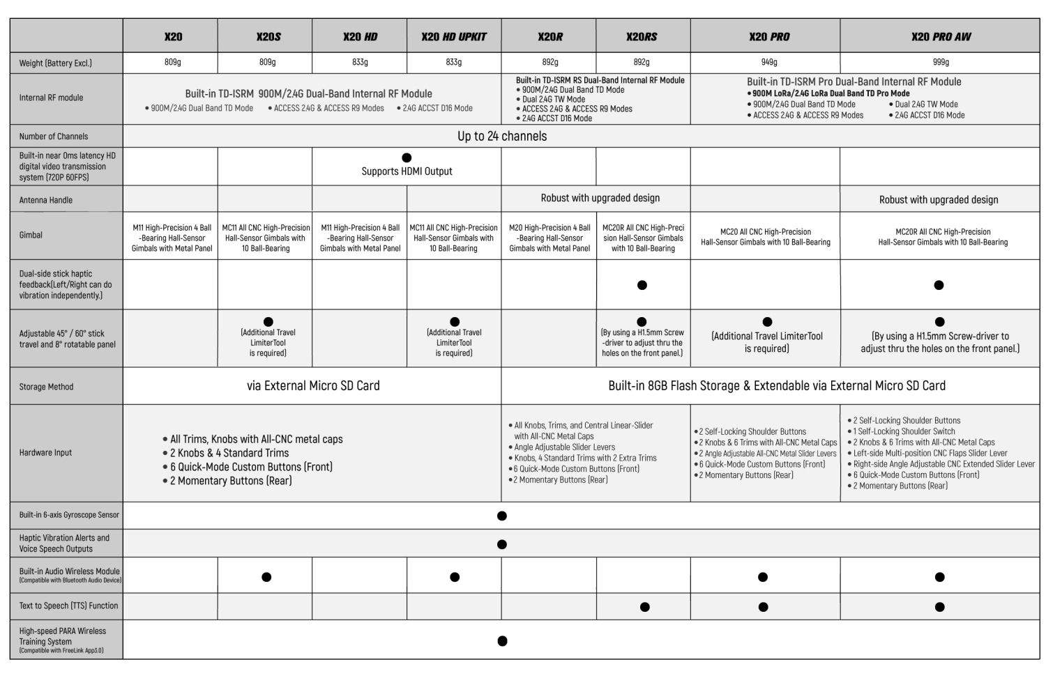 Das Aussehen der X20R und X20RS hat sich im Vergleich zum ursprünglichen X20-Design verändert. Der untere Handgriff übernimmt das Gesamtdesign der PRO-Version, sodass keine zusätzliche Griffabdeckung erforderlich ist und der untere Teil für einen bequemeren und entspannteren Griff vollständig mit der Handfläche umfasst werden kann. Darüber hinaus wurde der Steckplatz für externe Module vom Typ Lite angepasst, um mehr passenden Installationsraum für externe Module unterschiedlicher Formen zu bieten, was die Handhabung angenehmer macht. Die Versionen R und RS verfügen über zwei zusätzliche Trimmungen, die während des Betriebs präzisere Abstimmungen ermöglichen. Die Schiebehebel auf beiden Seiten des Senders unterstützen die Anpassung der Positionierung der Mitte und gehen auf die Gewohnheiten und Vorlieben verschiedener Benutzer ein. Die primären Eingabekomponenten, einschließlich Trimmkappen, Mittelschieberkappen und Knöpfe, sind alle aus Metall und bieten robuste Qualität und verbesserte Haltbarkeit für den Außeneinsatz.