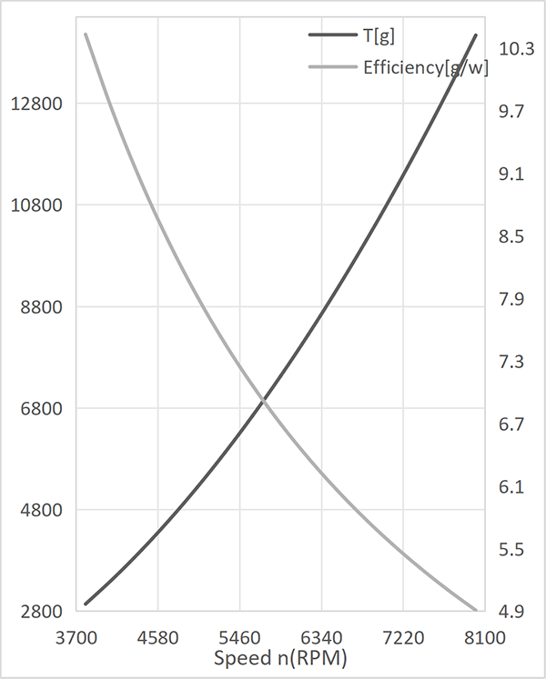 | Ambient Temperature 22 °C Altitude 25 m | RPM (RPM) | Torque (N·m) | RecommendedThrust (gf) | Output Power (W) | 力Effciency (gf/W) | |||