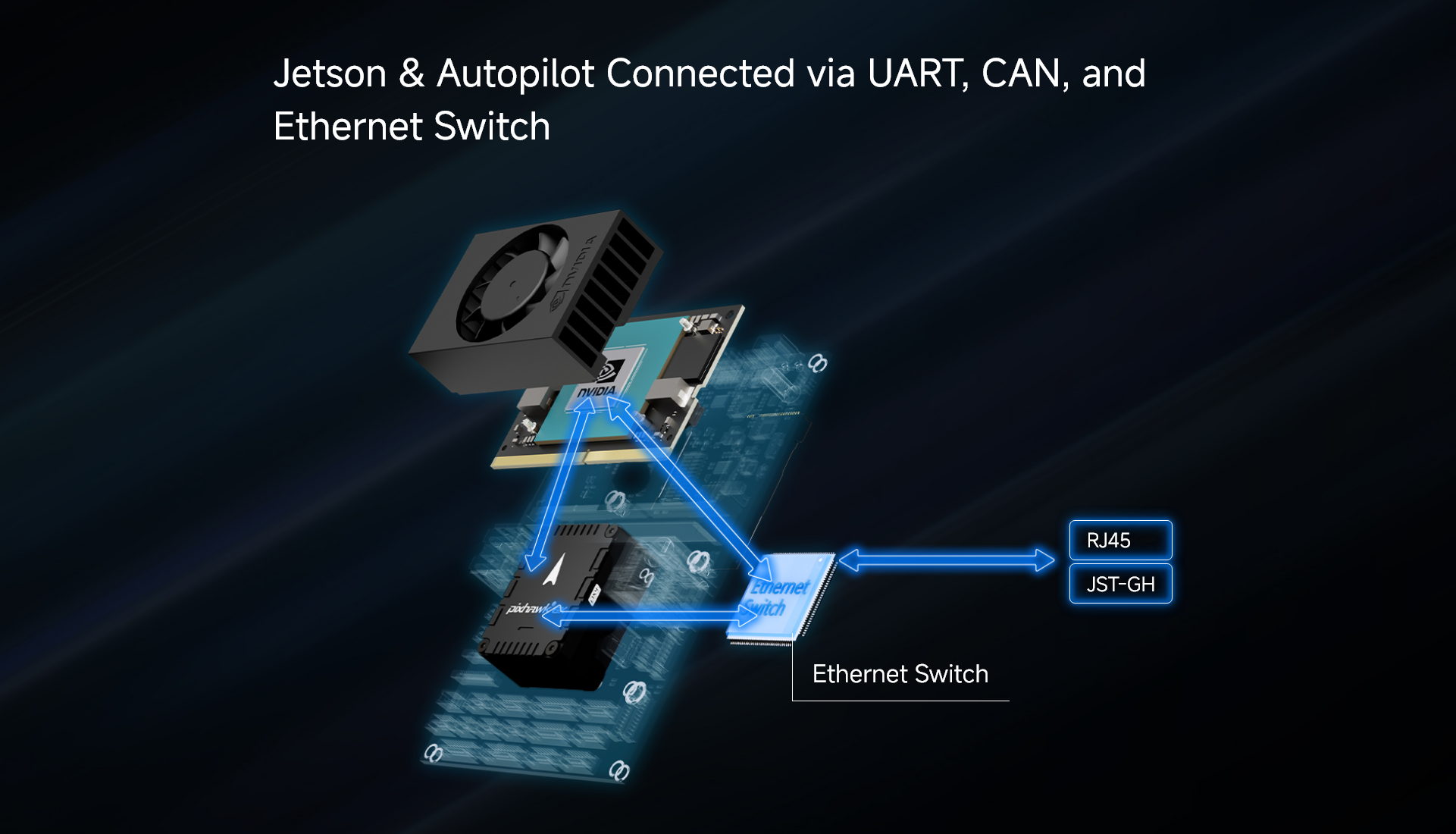 - Nvidia Jetson & Pixhawk connected via UART, CAN, and ethernet switch