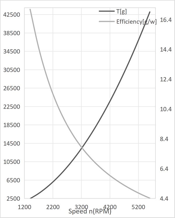 | Ambient Temperature 22 °C Altitude 25 m | RPM (RPM) | Torque (N·m) | RecommendedThrust (gf) | Output Power (W) | 力Effciency (gf/W) | |||