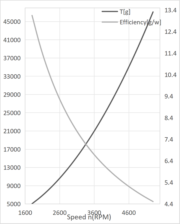 | Ambient Temperature 22 °C Altitude 25 m | RPM (RPM) | Torque (N·m) | RecommendedThrust (gf) | Output Power (W) | 力Effciency (gf/W) | |||
